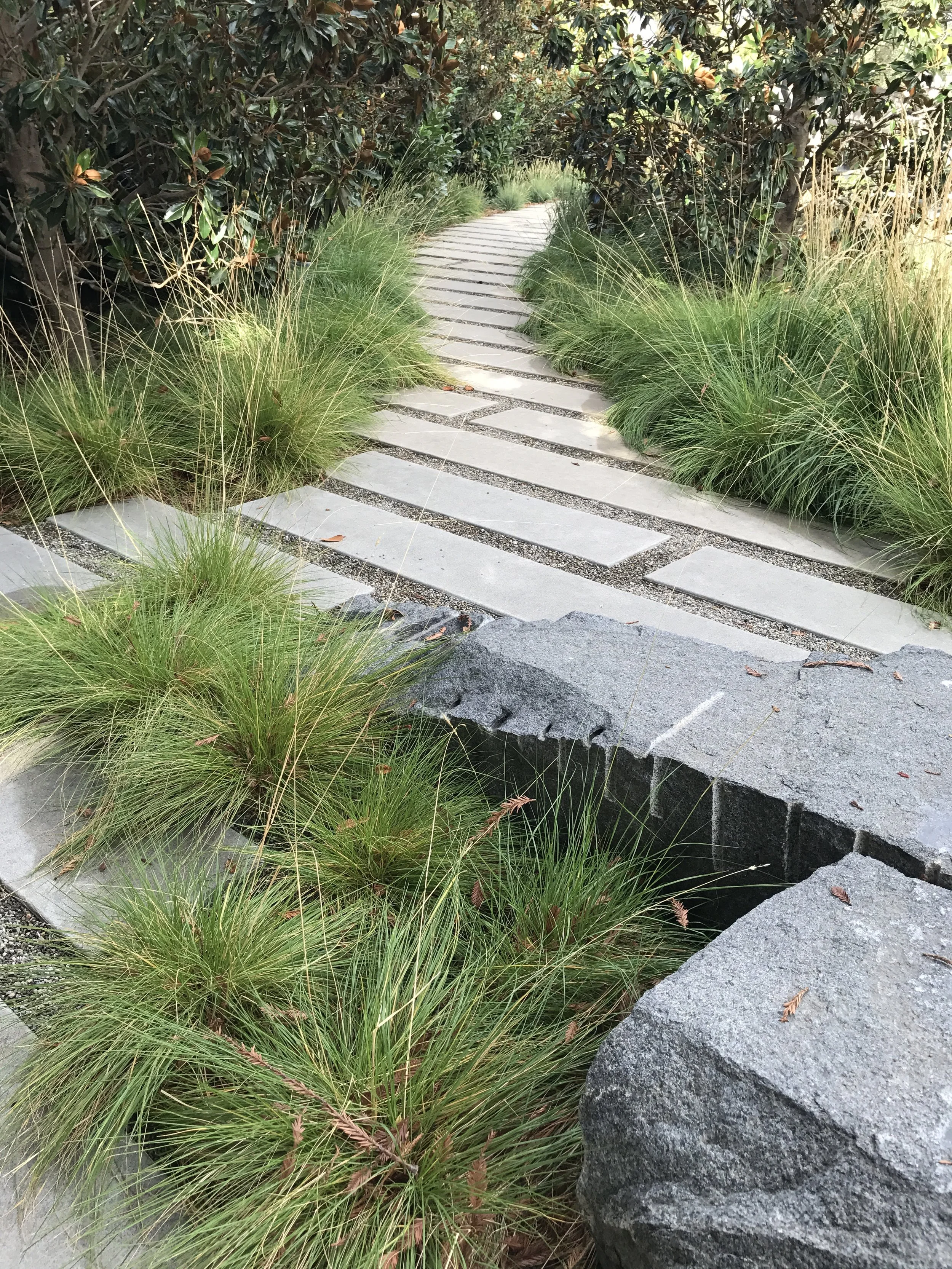 This project is situated in a quiet Palo Alto neighbourhood. The site offered opportunities to create meaningful connections between the mature trees with a balanced composition of built elements. The interplay of the natural and handmade elements define the garden. Enlisting the expert stone artist Edwin Hamilton added the sculptural touch needed to intentionally spilt boulders and realize the design of artful stone bench moments. Water adds tranquility into the sequence from bubbling acoustic features to the expansive rimless pool. Social and entertaining spaces rest defined among punctuated meadow like plantings. Well intentioned hedge screening gives the appearance that this suburban lot has no bounds.